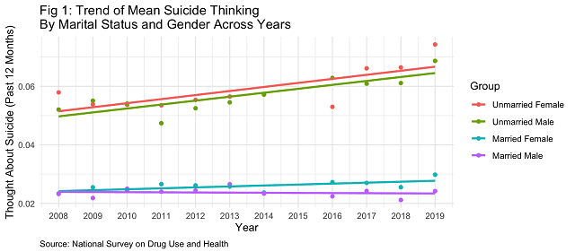 Suicide is a pressing public health challenge in the United States. In 2023 alone, almost 50,000 Americans died by suicide. Unfortunately, this number has been growing for over two decades. Dating back to Emile Durkheim, marriage has long been known to be protective against suicide. However, given that many facets of marriage and culture have changed considerably over the past decades, we sought to examine whether this well-documented protective association between marriage and the risk for suicidal thoughts and behaviors has changed. To do so, we analyzed over a decade of data (2008-2019) from the National Survey on Drug Use and Health (NSDUH).