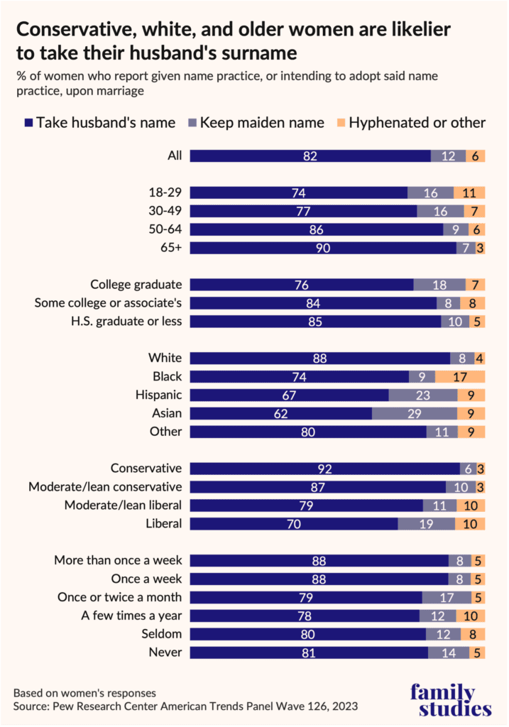 The standout point here is that there are large differences in naming norms by politics, age, and race. While 88% of white women in our analysis took or will take their husband’s name, it’s less than 70% of Hispanic1 and Asian women. And while 92% of conservative women adopt the patronym, just 70% of liberal women do. These gaps are as big or bigger than the observed age gaps, and they parallel gaps observed by my colleague Brad Wilcox in his book Get Married. In a 2022 YouGov survey of married women, he found that more educated, secular, and left-leaning women are less likely to share surnames with their husbands.